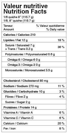 Garniture (Lait 2%; poireaux, œuf, fromage suisse, farine non blanchie sel, poivre, muscade, Pâte à tarte (Farine d'avoine, farine non blanchie, beurre non salé, eau, sucre, sel).